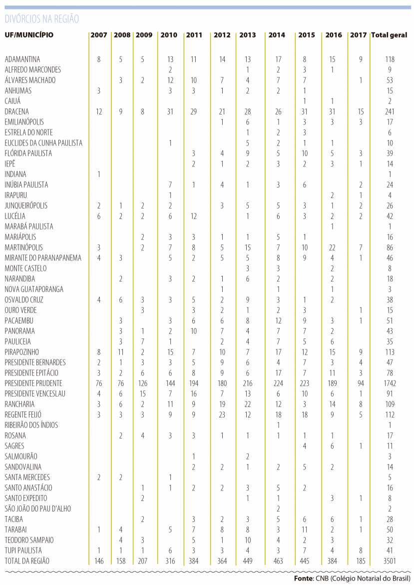 O levantamento demonstra que por dois anos consecutivos o número de divórcios diminuiu na região, contrariando o cenário nacional que aponta a expansão deste processo. Na listagem dos municípios foram consideradas 48 cidades da 10ª RA (veja tabela), sendo descartadas apenas as municipalidades que não possuem cartório de notas em seu território.